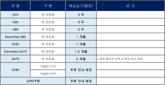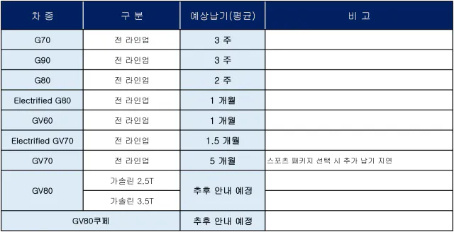 제네시스의 경우 10월에 GV80 페이스리프트 및 쿠페모델 사전예약 진행예정입니다.
