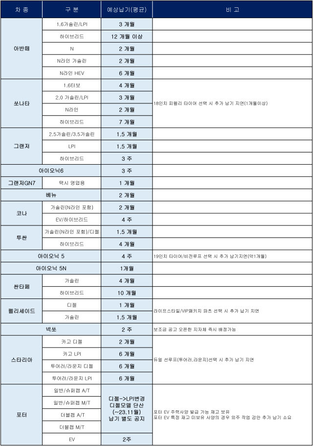 10월 현대자동차 납기표는 아래 링크에서 다운로드 가능합니다.